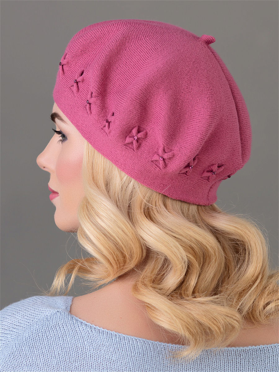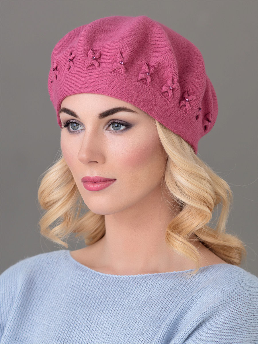 Элегантный классический берет из высококачественного объемного акрила с внутренним подворотом. Декорирован вывязанными элементами в виде бантиков и украшен стразами. Фабрика Junberg, Россия.