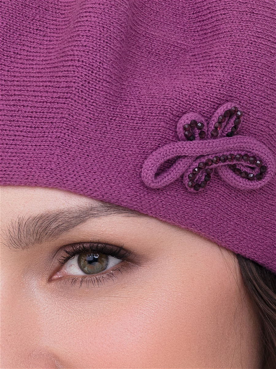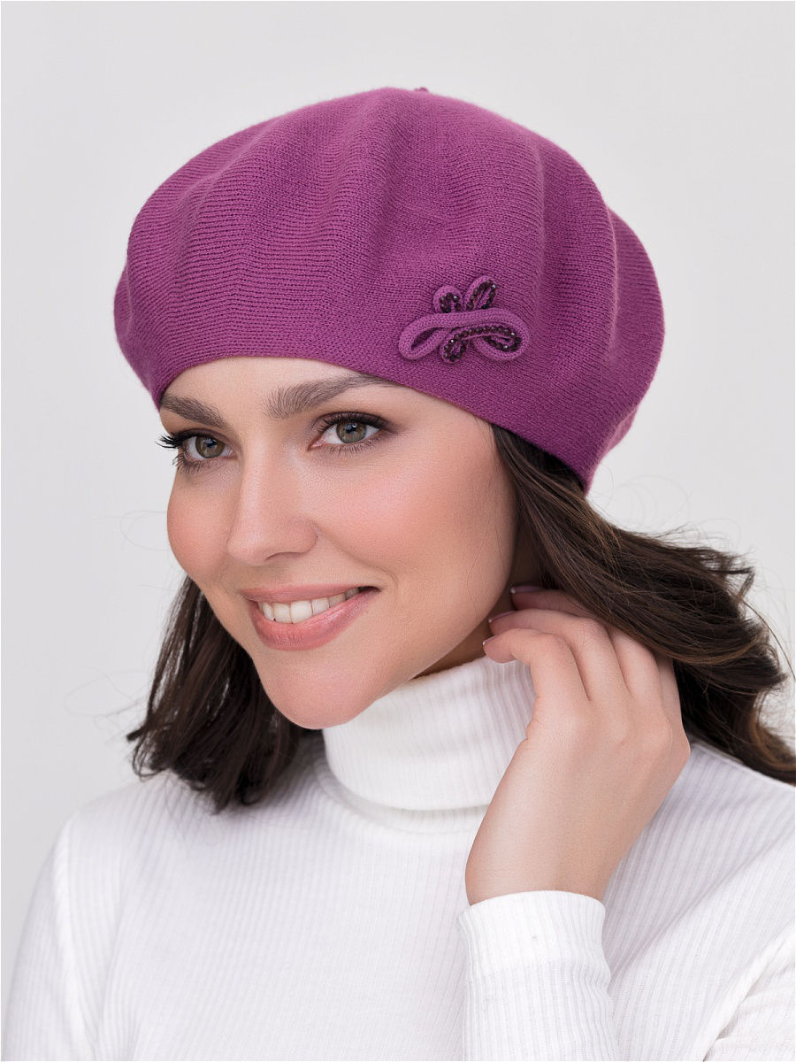 Элегантный классический одинарный берет из нежного высококачественного акрила. Декорирован украшением ручной работы с дополнением из страз. Фабрика Junberg, Россия.