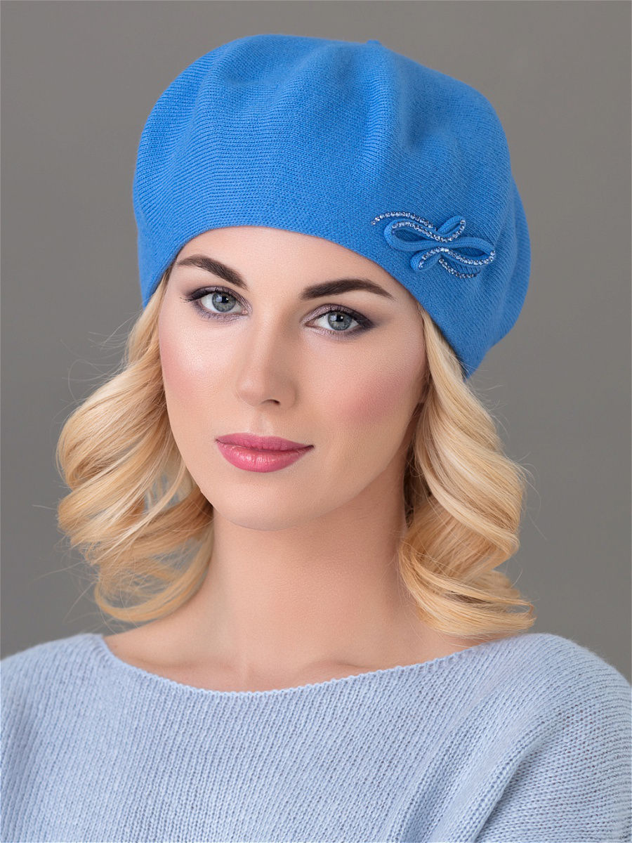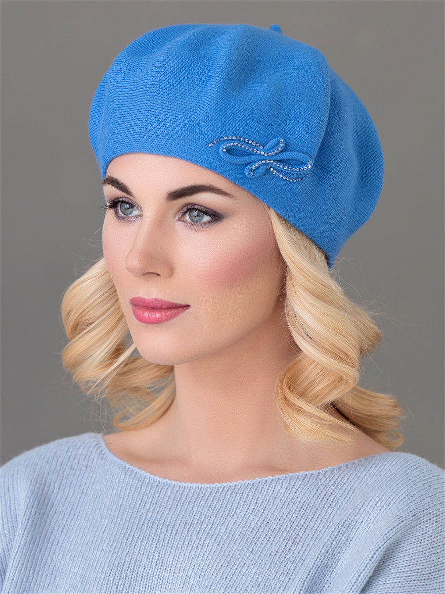 Элегантный классический берет из высококачественного объемного акрила с внутренним подворотом. Декорирован элегантным украшением ручной работы, украшен стразами. Фабрика Junberg, Россия.