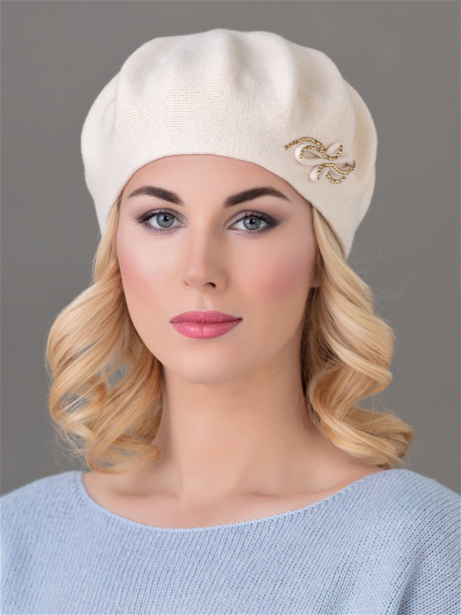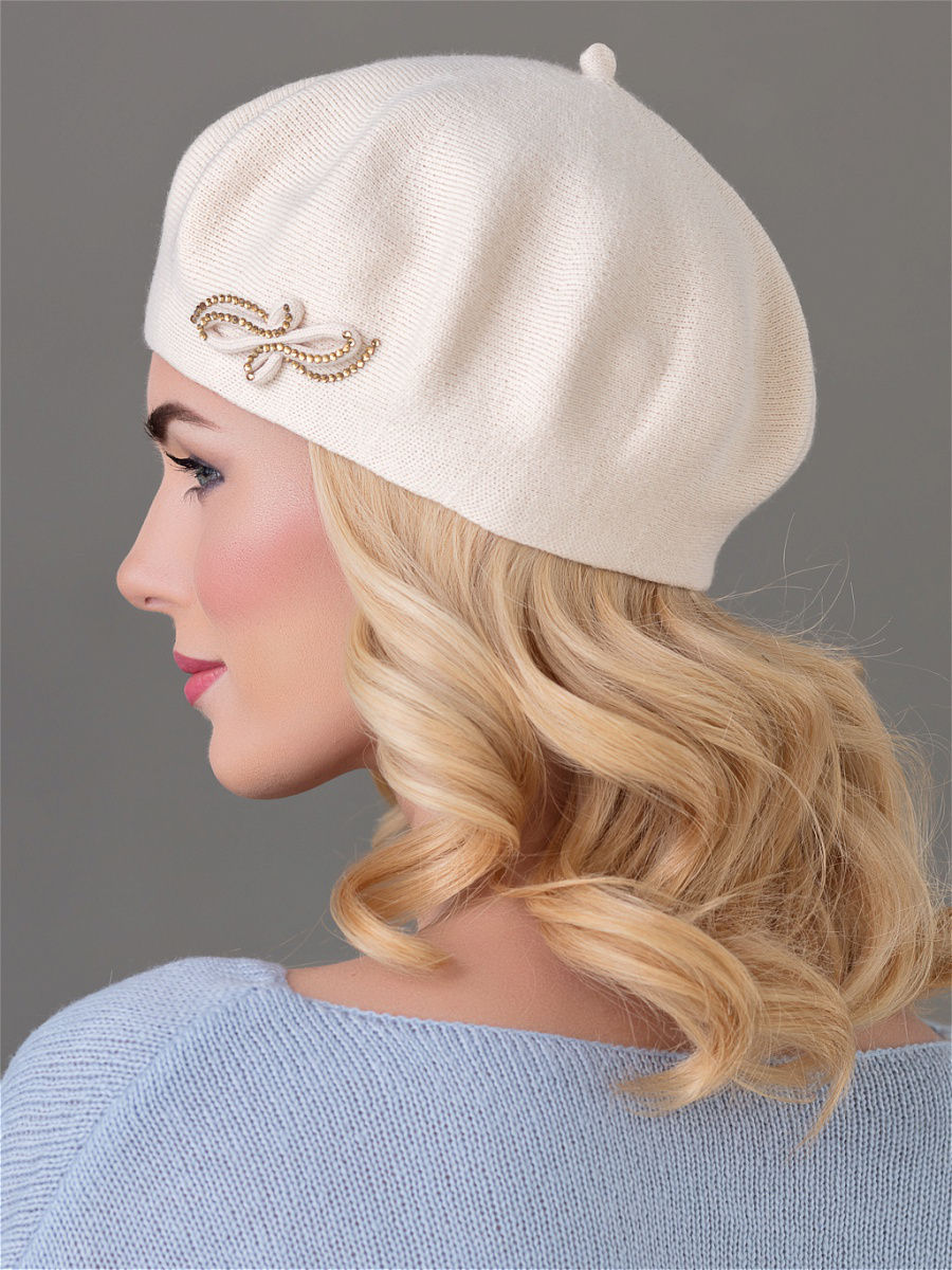 Элегантный классический берет из высококачественного объемного акрила с внутренним подворотом. Декорирован элегантным украшением ручной работы, украшен стразами. Фабрика Junberg, Россия.