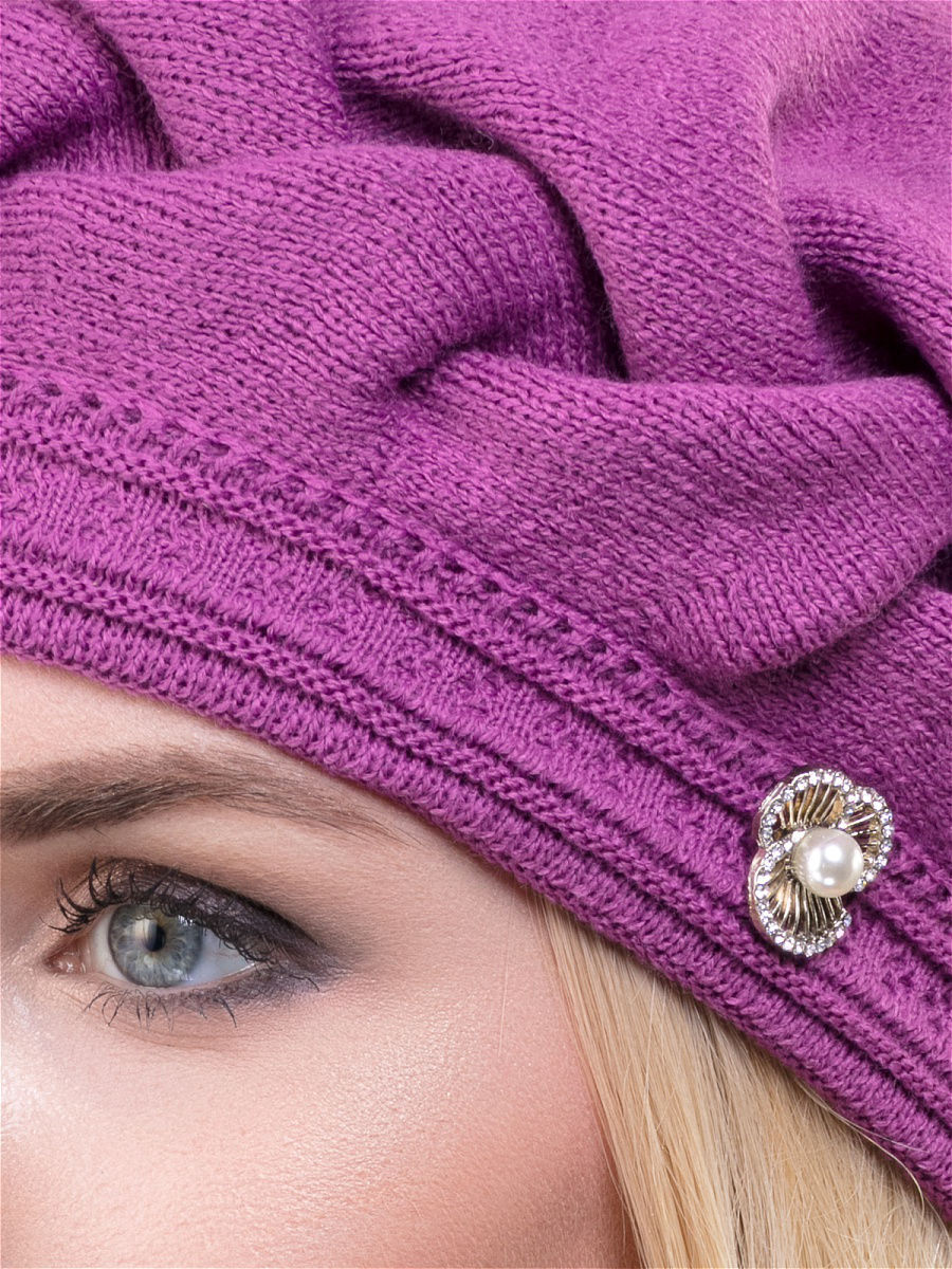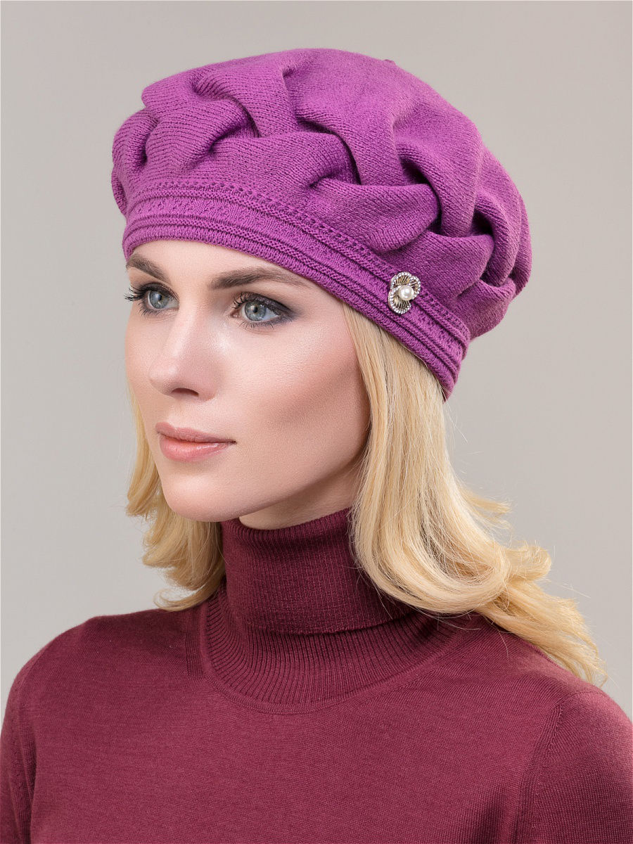 Элегантный теплый двойной берет из высококачественного объемного акрила. Имеет оригинальную форму с ручной сборкой по периметру в виде косы. Декорирован элегантным украшением в виде небольшой броши. Фабрика Junberg, Россия.