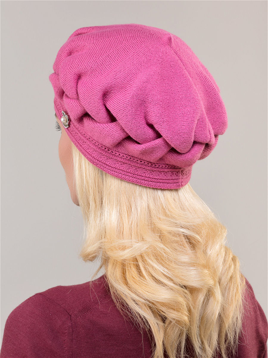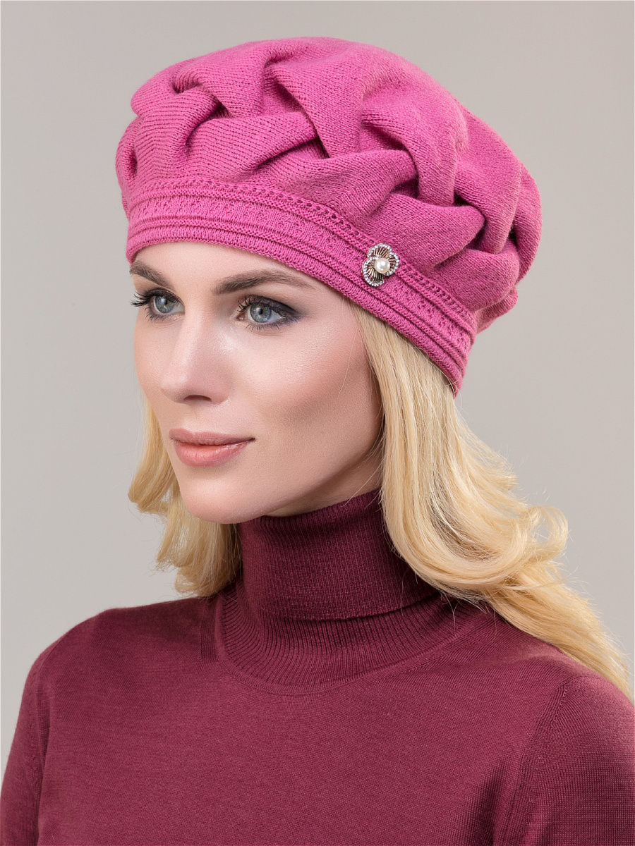 Элегантный теплый двойной берет из высококачественного объемного акрила. Имеет оригинальную форму с ручной сборкой по периметру в виде косы. Декорирован элегантным украшением в виде небольшой броши. Фабрика Junberg, Россия.