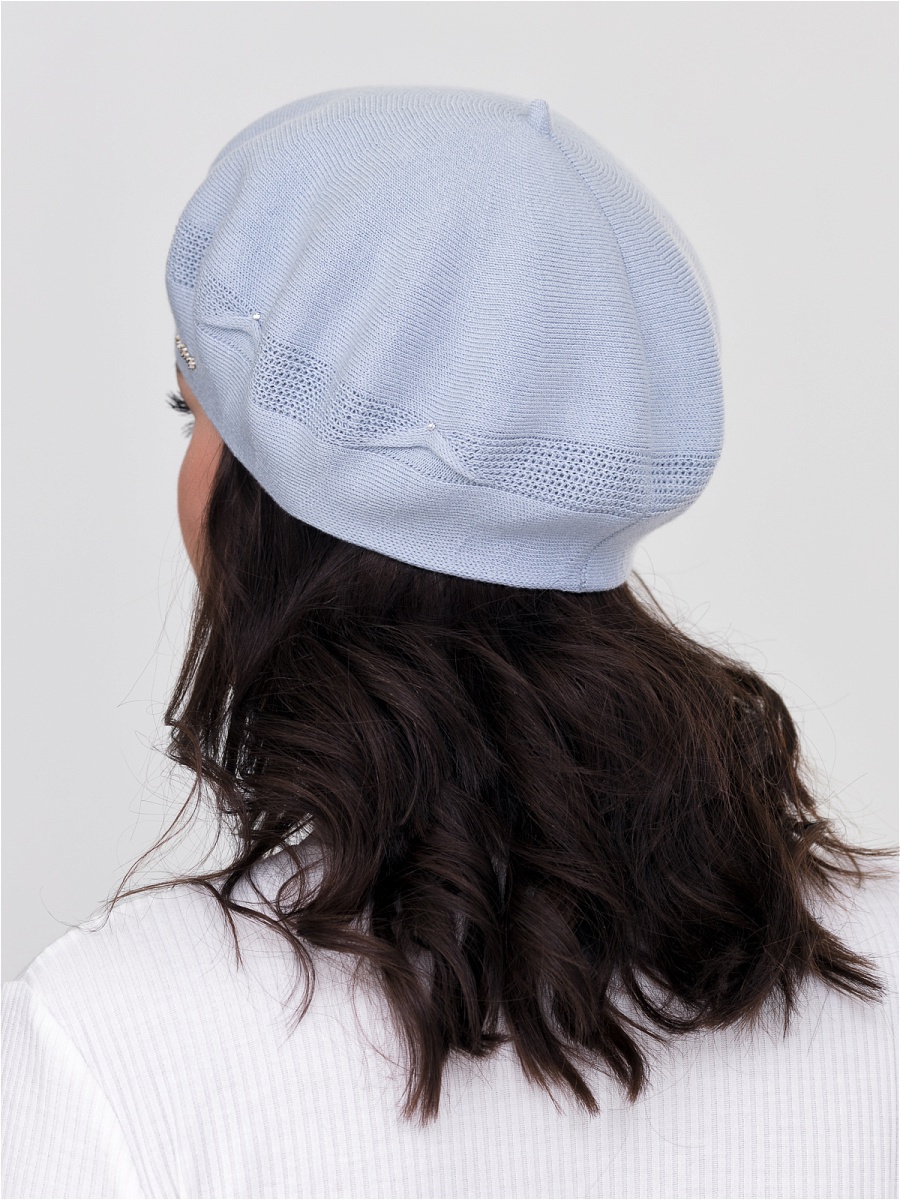 Элегантный одинарный берет с оригинальными вывязанными элементами. Выполнен из нежной пряжи. Декорирован стразами и фирменной фурнитурой. Фабрика Junberg, Россия.