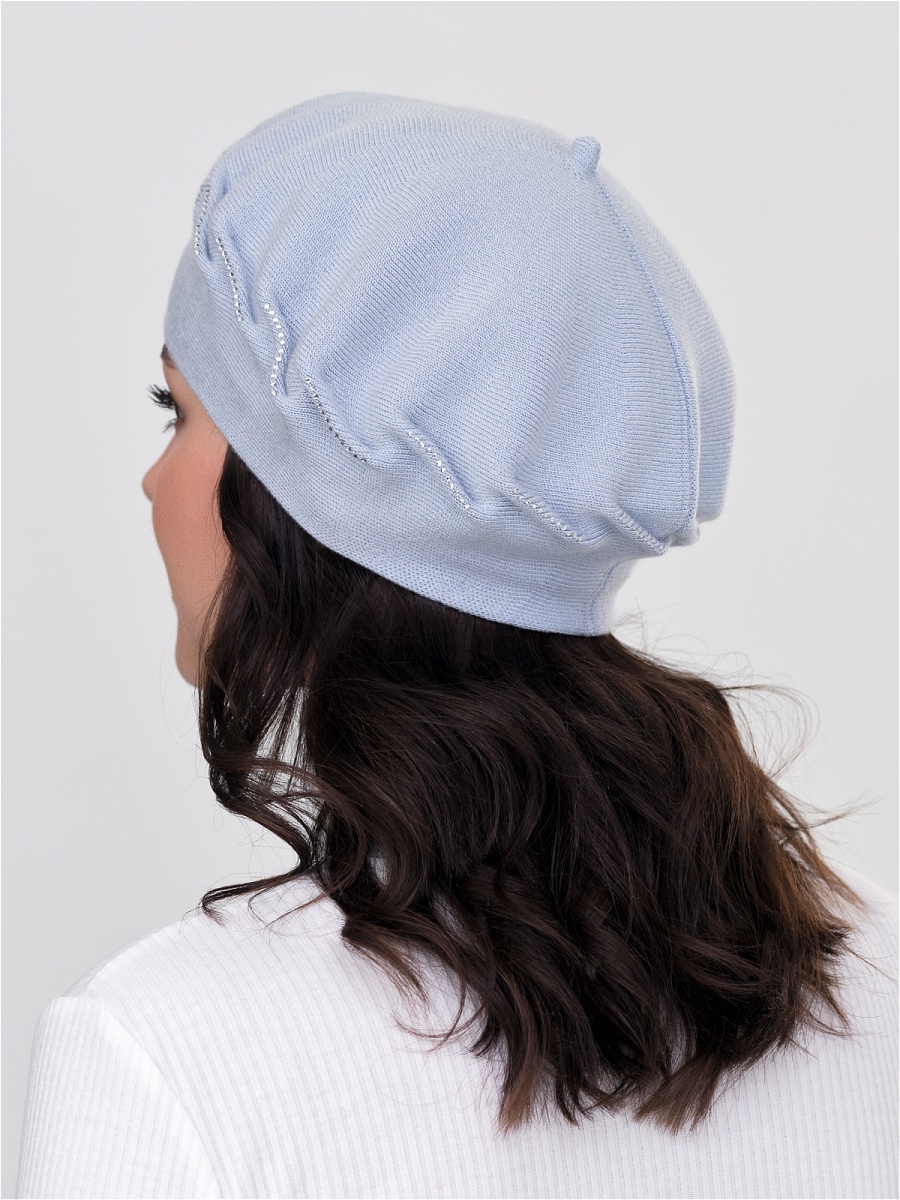Классический одинарный берет из нежной пряжи. Декорирован отстроченными элементами, дополненными композицией из страз. Фабрика Junberg, Россия.