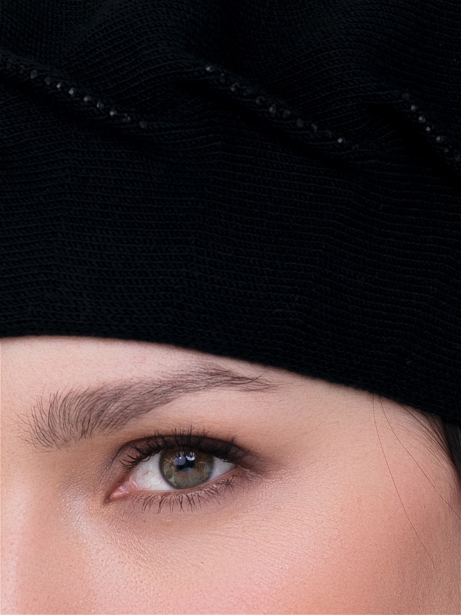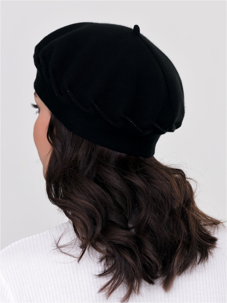 Классический одинарный берет из нежной пряжи. Декорирован отстроченными элементами, дополненными композицией из страз. Фабрика Junberg, Россия.