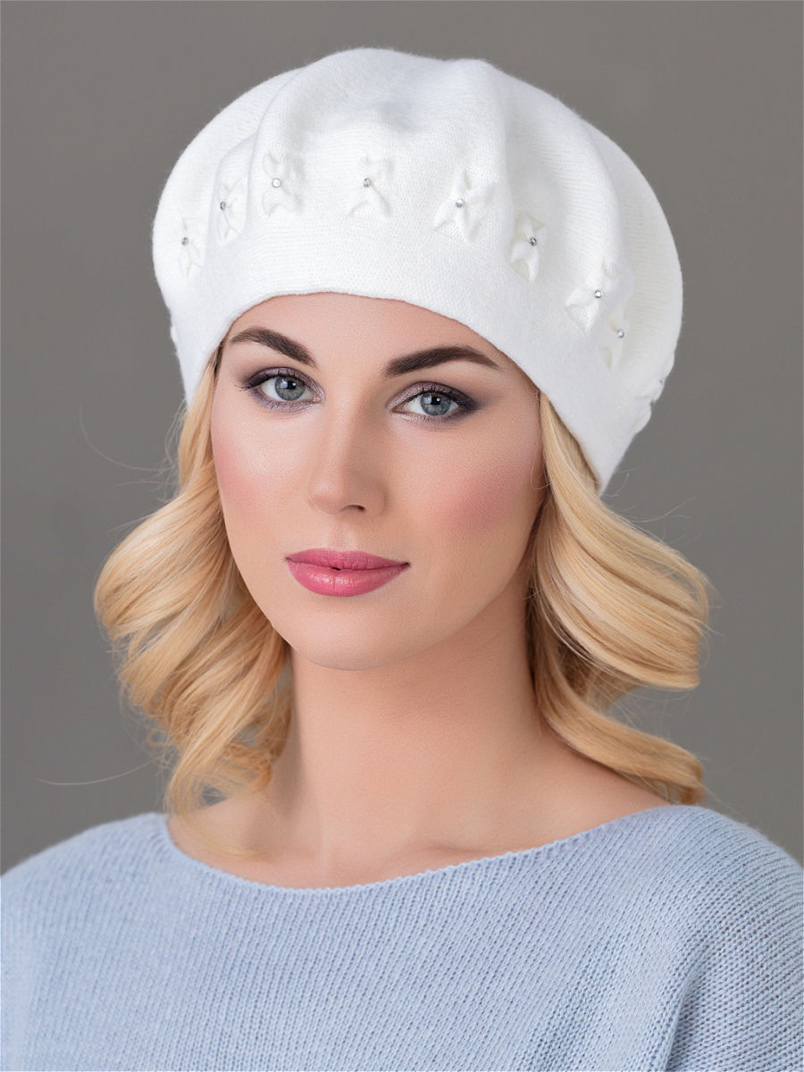 Элегантный классический берет из высококачественного объемного акрила с внутренним подворотом. Декорирован вывязанными элементами в виде бантиков и украшен стразами. Фабрика Junberg, Россия.