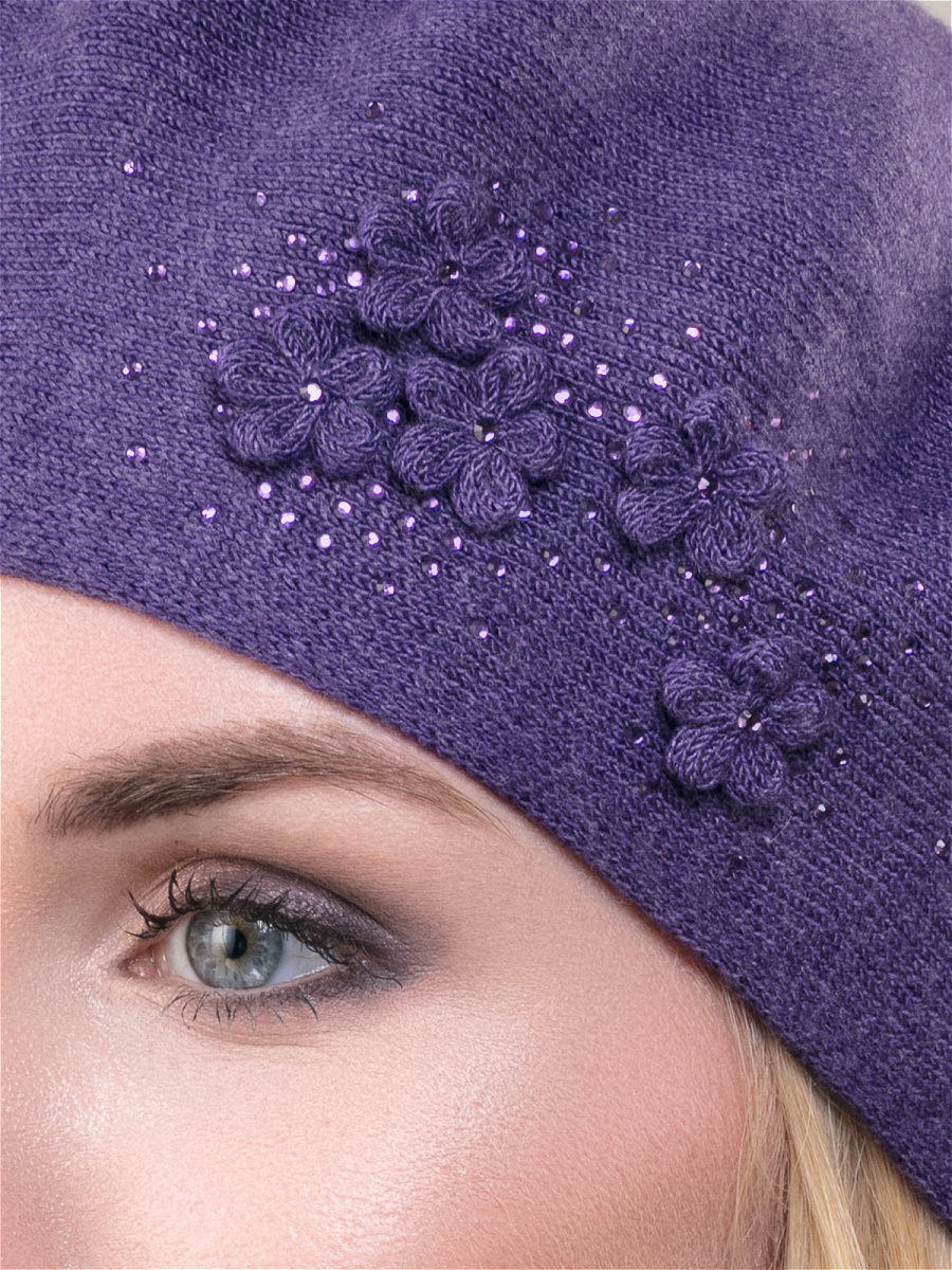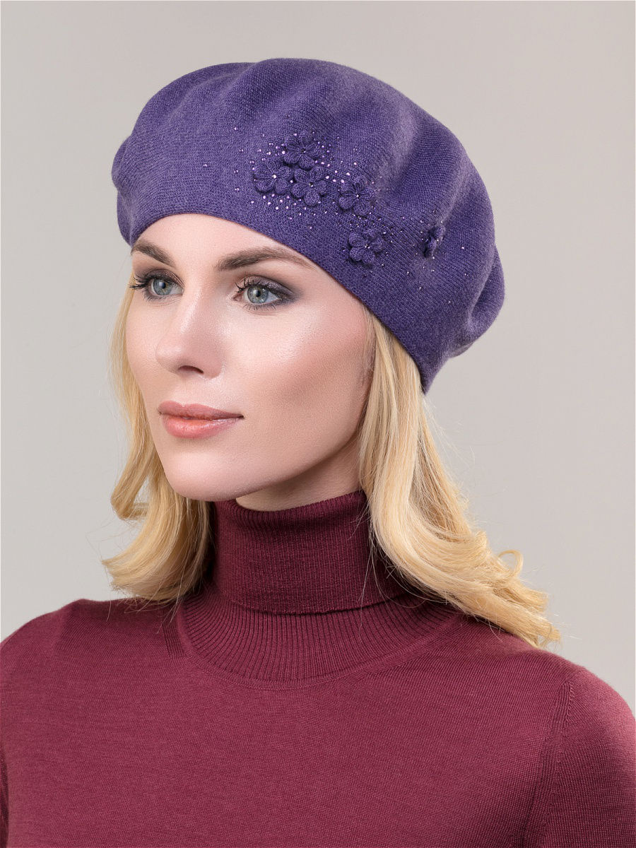 Элегантный двойной берет классической формы из мягкой высококачественной пряжи. Декорирован аппликацией из страз и элементами ручной работы.