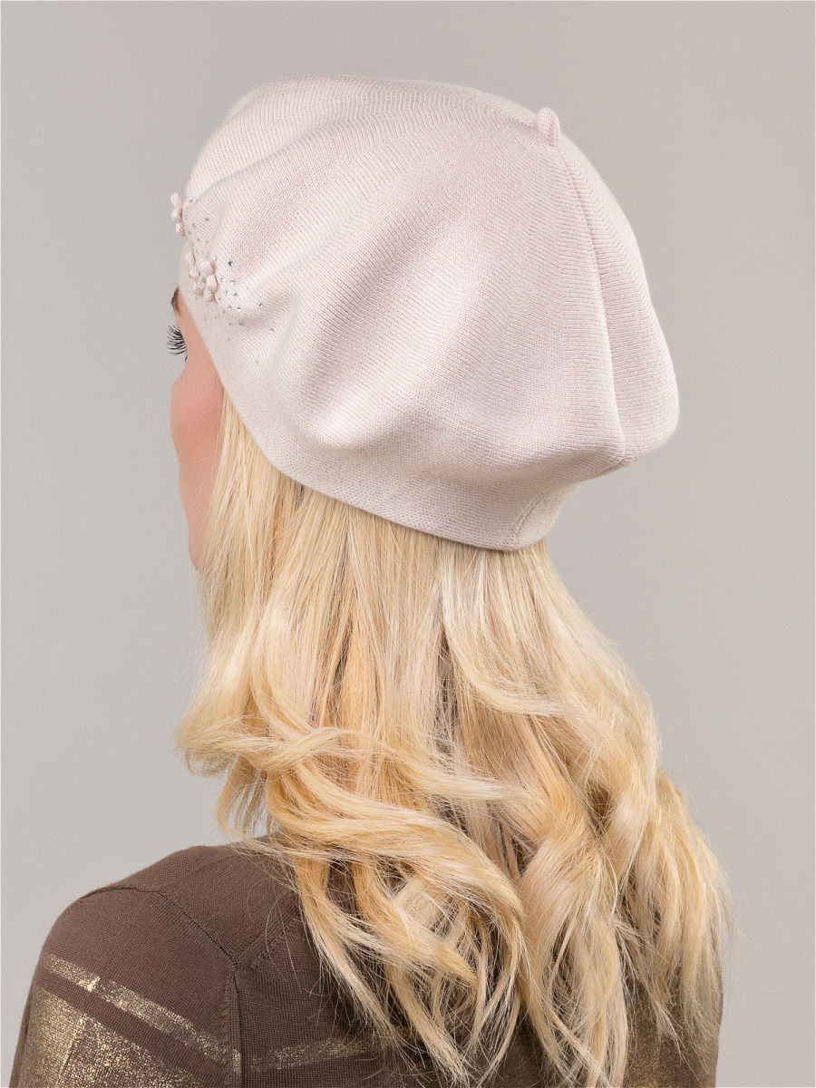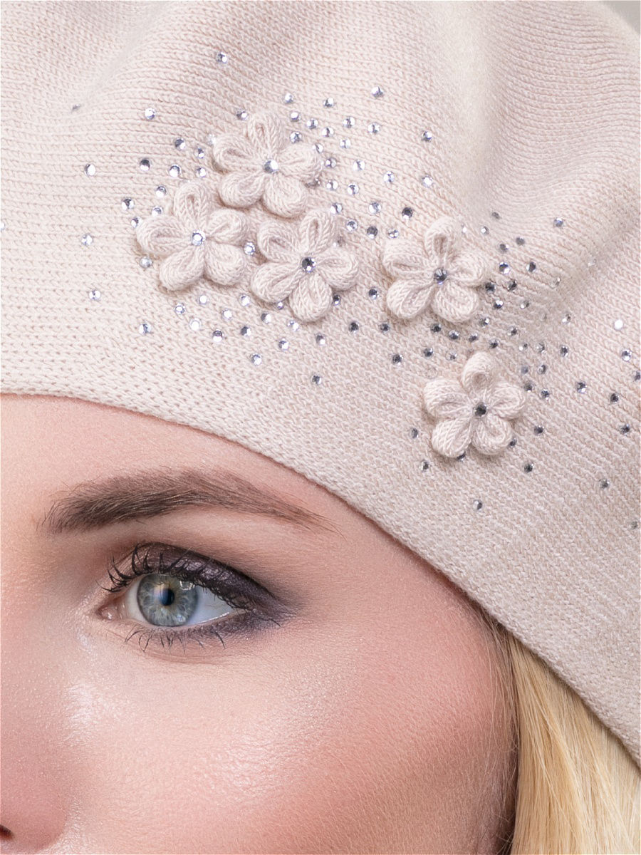 Элегантный двойной берет классической формы из мягкой высококачественной пряжи. Декорирован аппликацией из страз и элементами ручной работы.