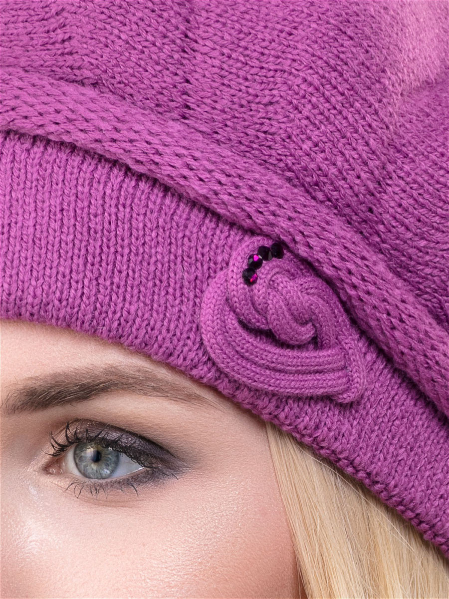 Элегантный берет одинарной или двойной вязки (на выбор) из высококачественного объемного акрила. Имеет оригинальную форму и декорирован элегантным украшением ручной работы с дополнением из страз и фирменной фурнитуры. Фабрика Junberg, Россия.