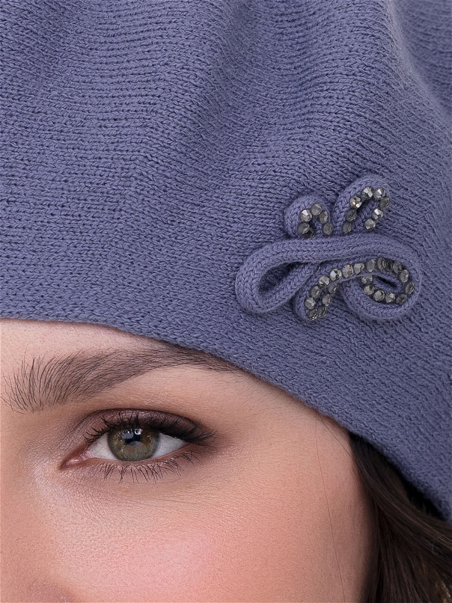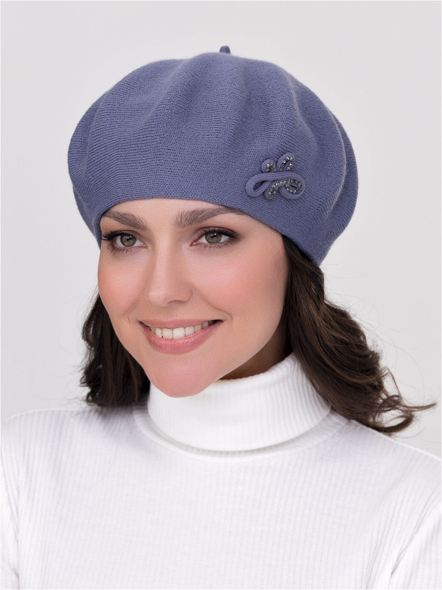 Элегантный классический одинарный берет из нежного высококачественного акрила. Декорирован украшением ручной работы с дополнением из страз. Фабрика Junberg, Россия.