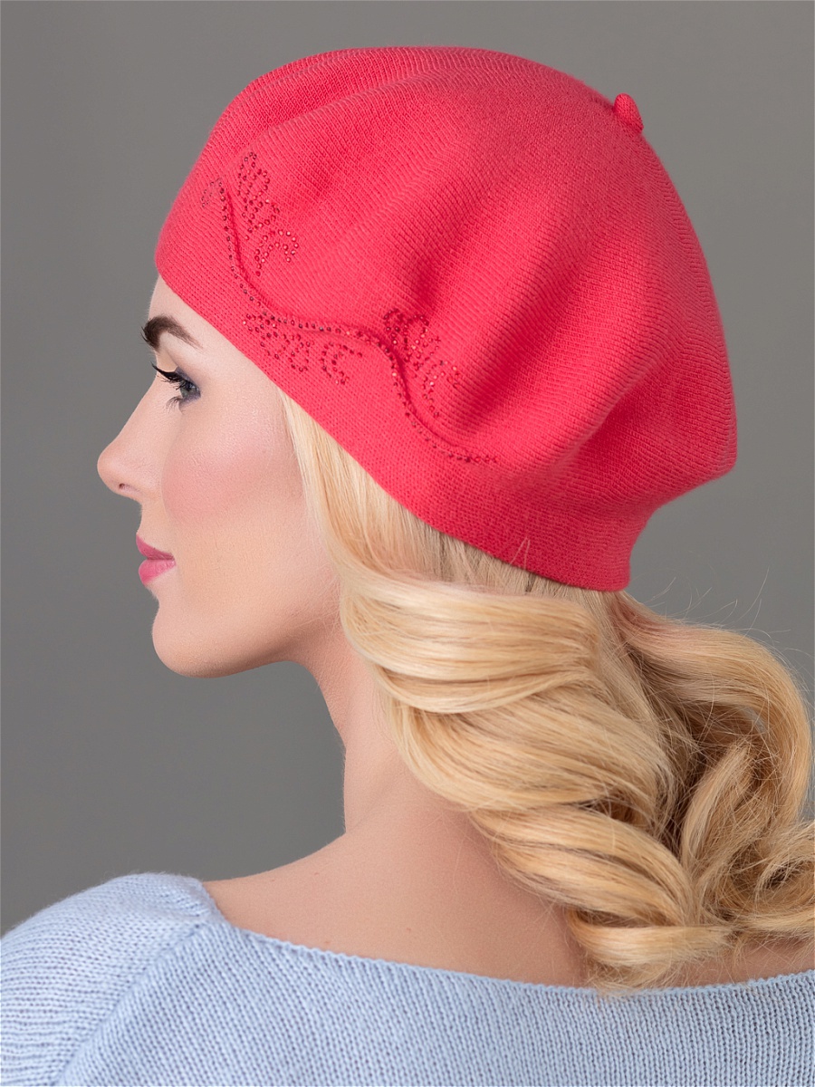 Элегантный берет классической формы из нежной итальянской пряжи с внутренним подворотом. Декорирован отстроченной изогнутой линией, дополненной композицией из страз. Фабрика Junberg, Россия.