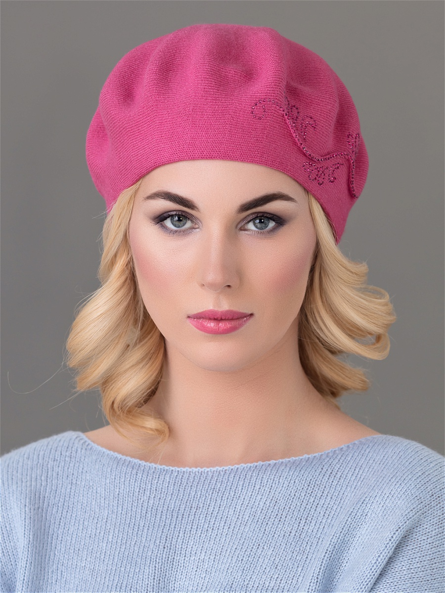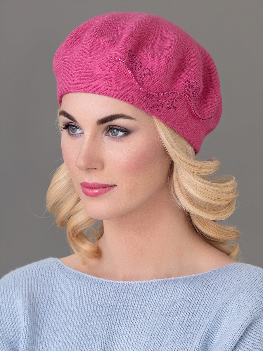 Элегантный берет классической формы из нежной итальянской пряжи с внутренним подворотом. Декорирован отстроченной изогнутой линией, дополненной композицией из страз. Фабрика Junberg, Россия.
