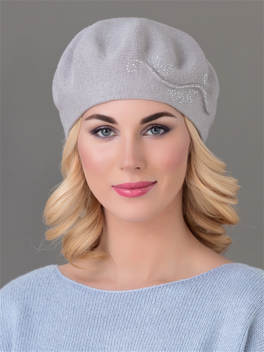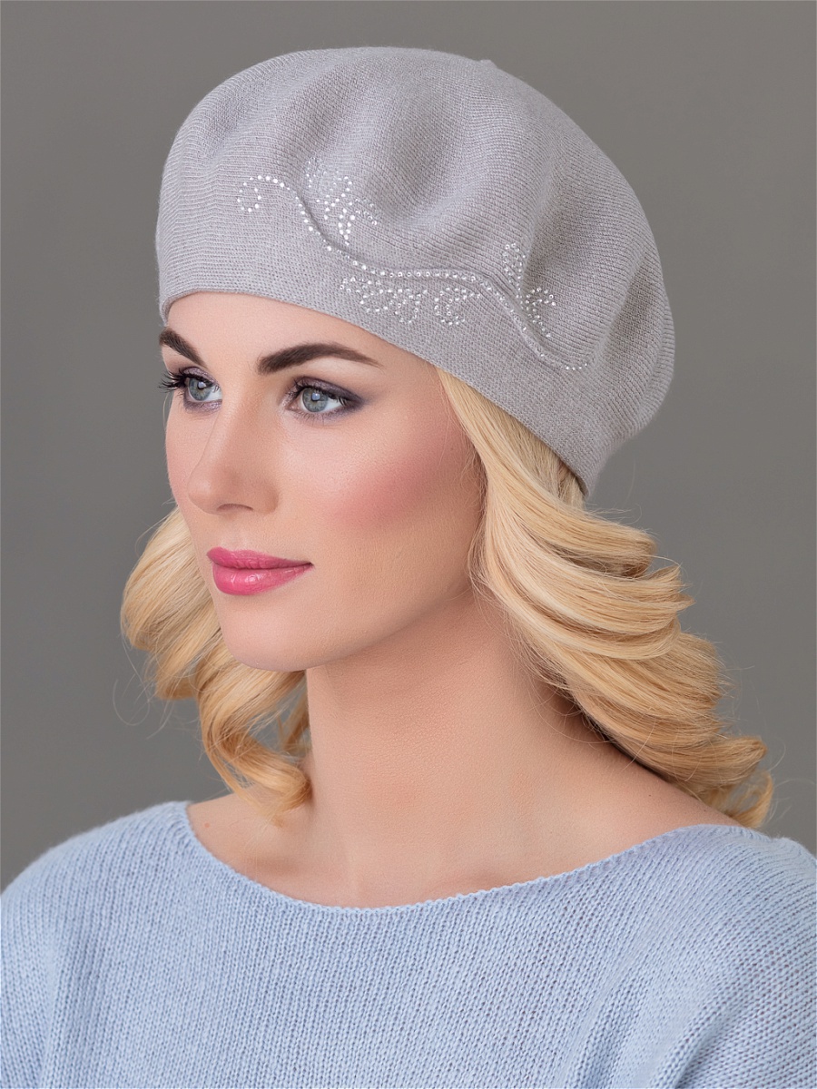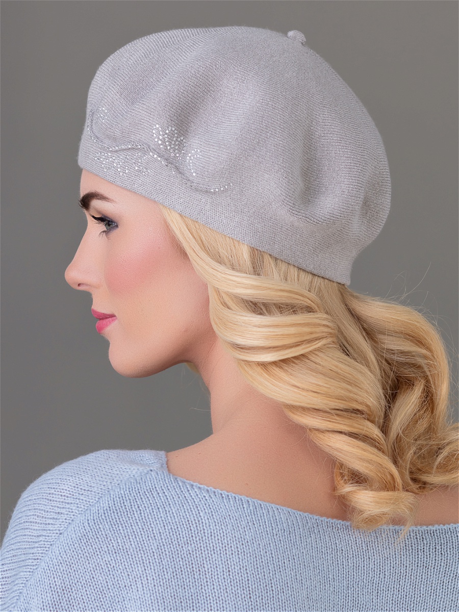 Элегантный берет классической формы из нежной итальянской пряжи с внутренним подворотом. Декорирован отстроченной изогнутой линией, дополненной композицией из страз. Фабрика Junberg, Россия.