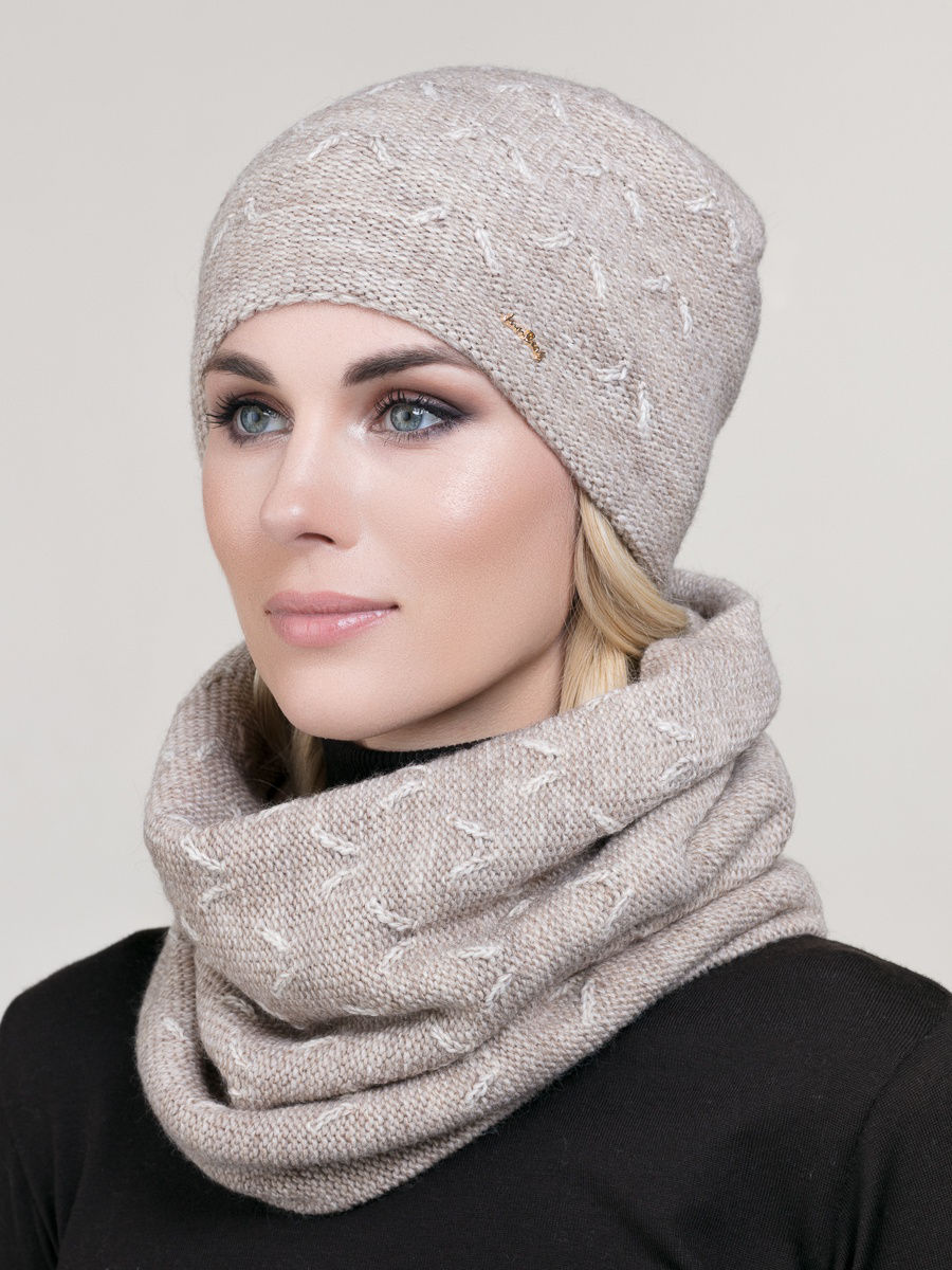 Модная шапка из мягкой итальянской пряжи в комплекте со снудом. Декорирована стильной металлической биркой с логотипом Фабрики Junberg.