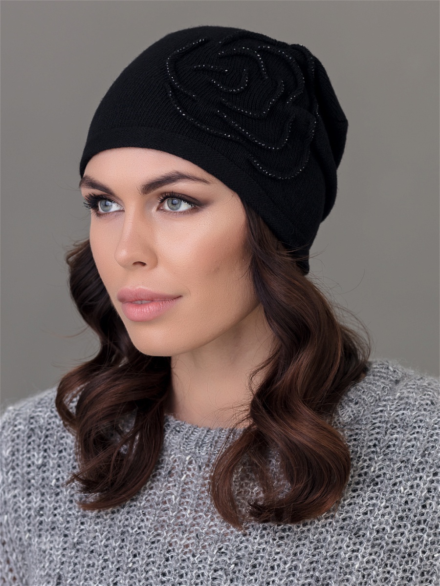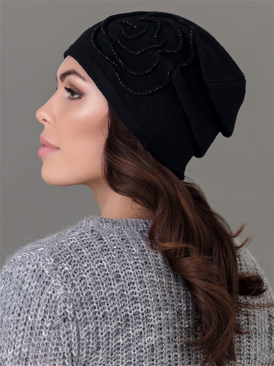 Удлиненная одинарная шапка из мягкой пряжи с добавлением кашемира. Декорирована розой, выполненной в виде отстроченных изогнутых линий и украшенной стразами. Фабрика Junberg, Россия.