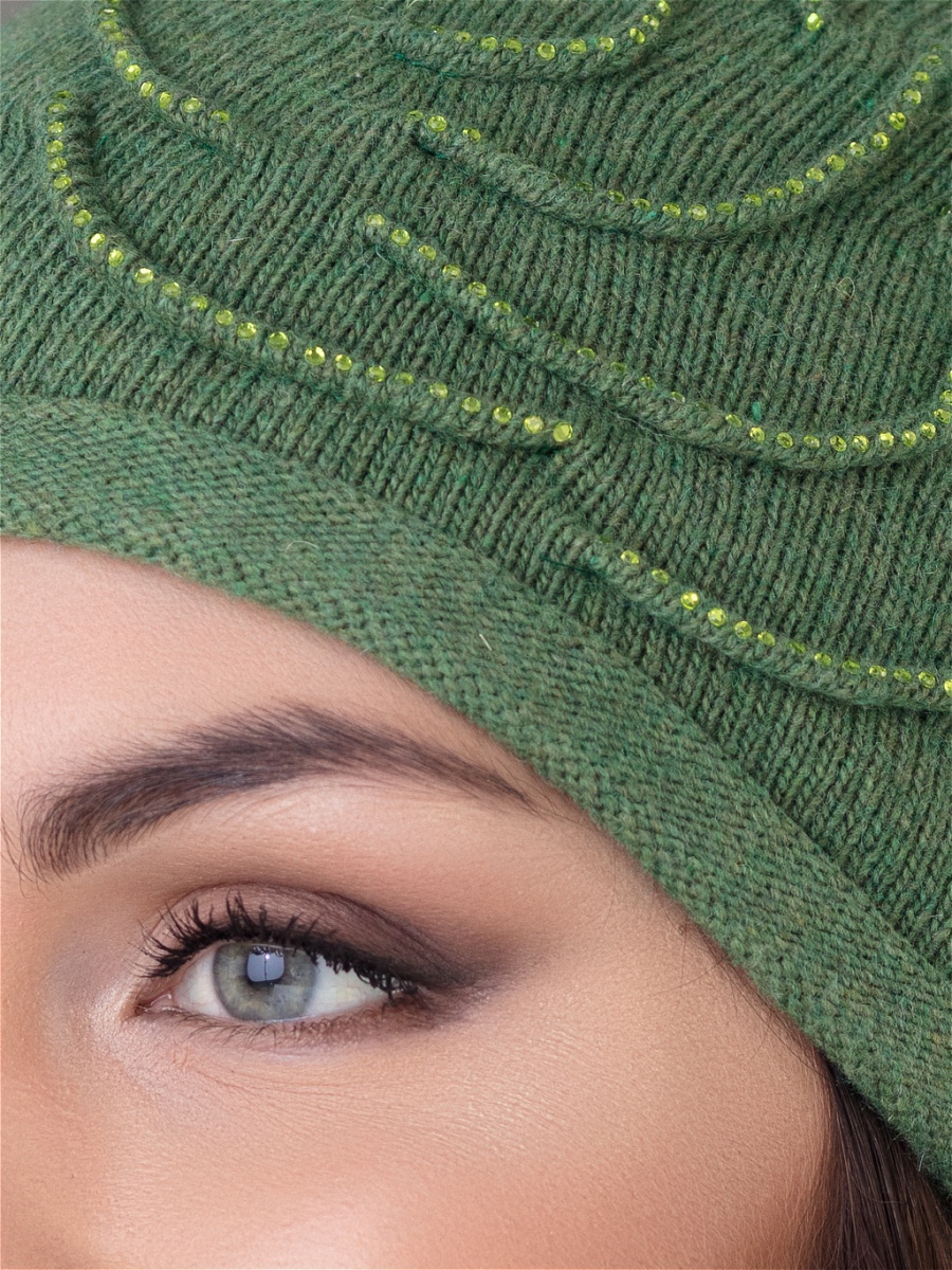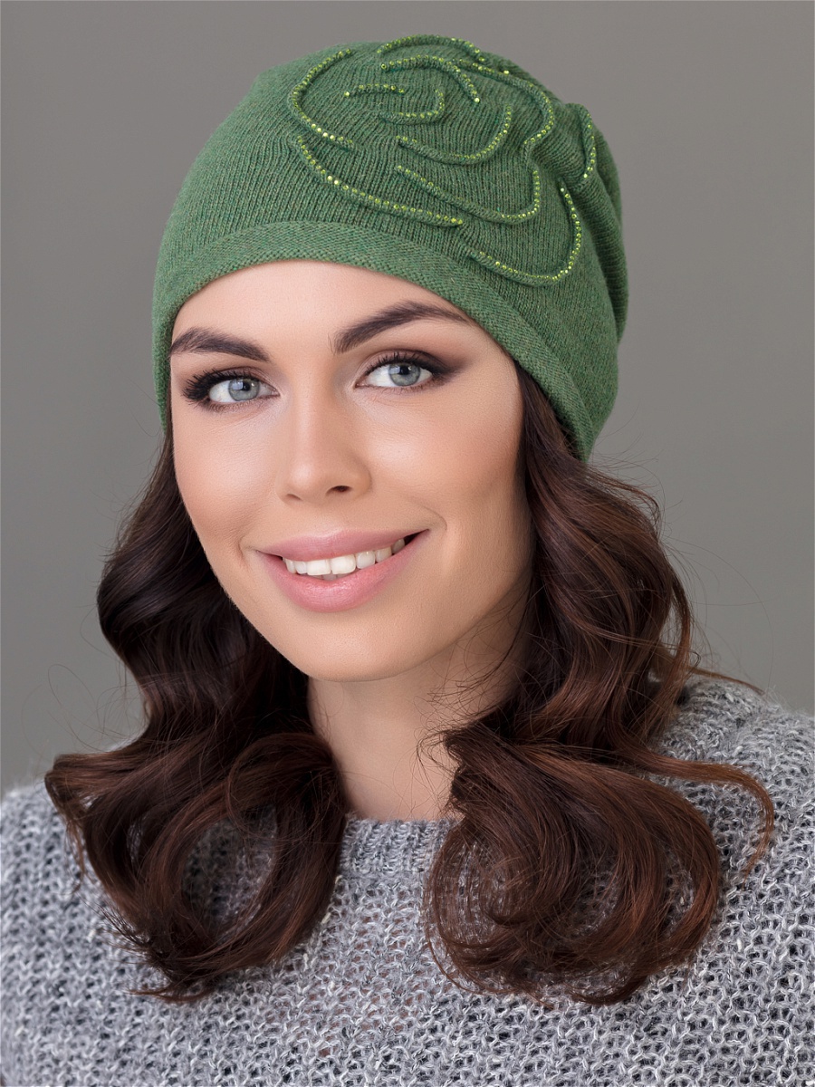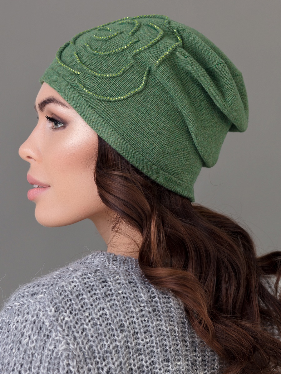 Удлиненная одинарная шапка из мягкой пряжи с добавлением кашемира. Декорирована розой, выполненной в виде отстроченных изогнутых линий и украшенной стразами. Фабрика Junberg, Россия.