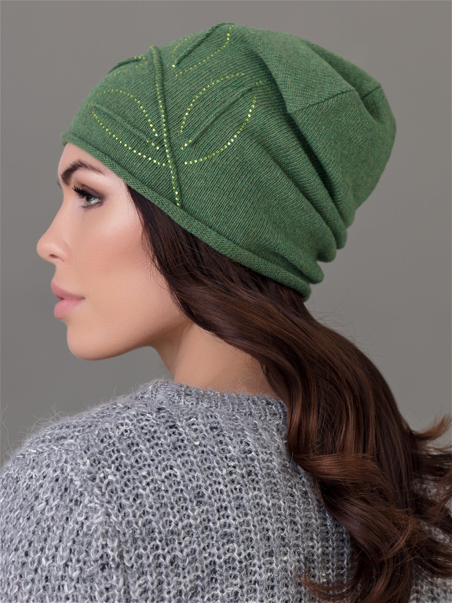 Одинарная шапка из нежной пряжи с добавлением кашемира. Декорирована элегантным узором в виде ветки с отстроченными элементами, дополненный композицией из страз в виде лепестков. Фабрика Junberg, Россия.