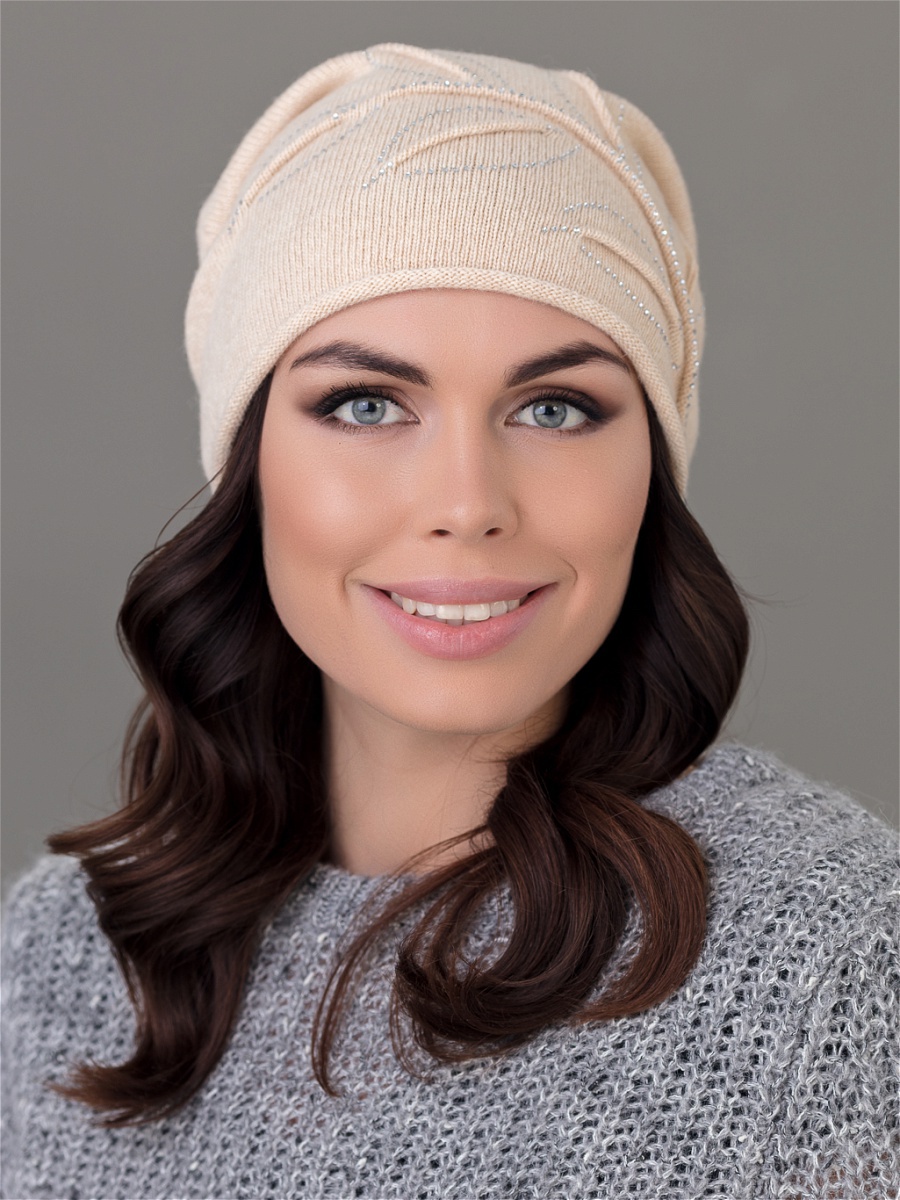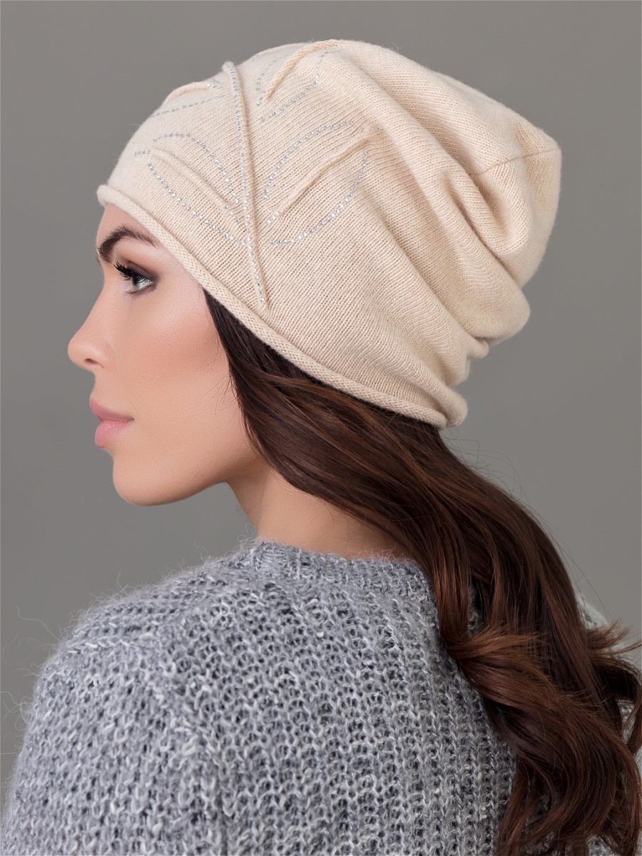 Одинарная шапка из нежной пряжи с добавлением кашемира. Декорирована элегантным узором в виде ветки с отстроченными элементами, дополненный композицией из страз в виде лепестков. Фабрика Junberg, Россия.