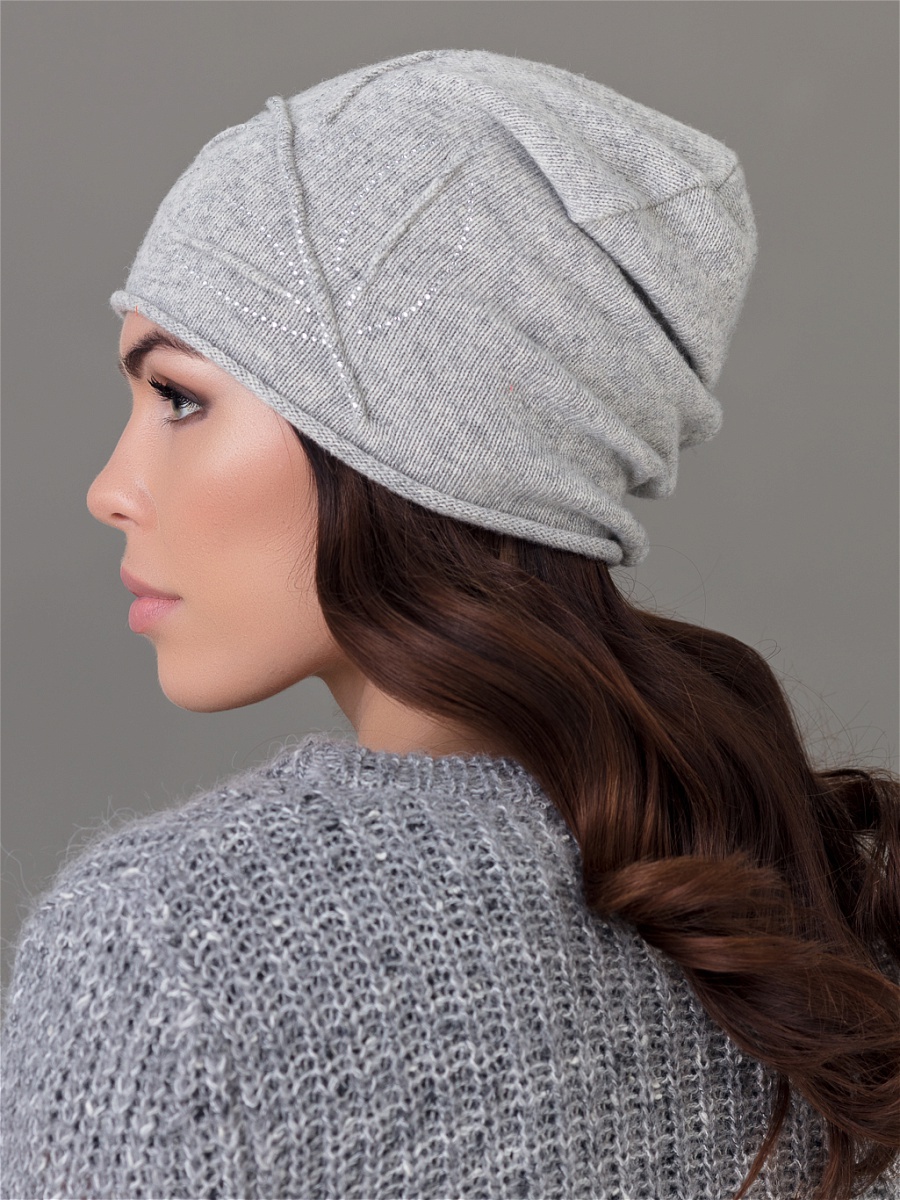 Одинарная шапка из нежной пряжи с добавлением кашемира. Декорирована элегантным узором в виде ветки с отстроченными элементами, дополненный композицией из страз в виде лепестков. Фабрика Junberg, Россия.