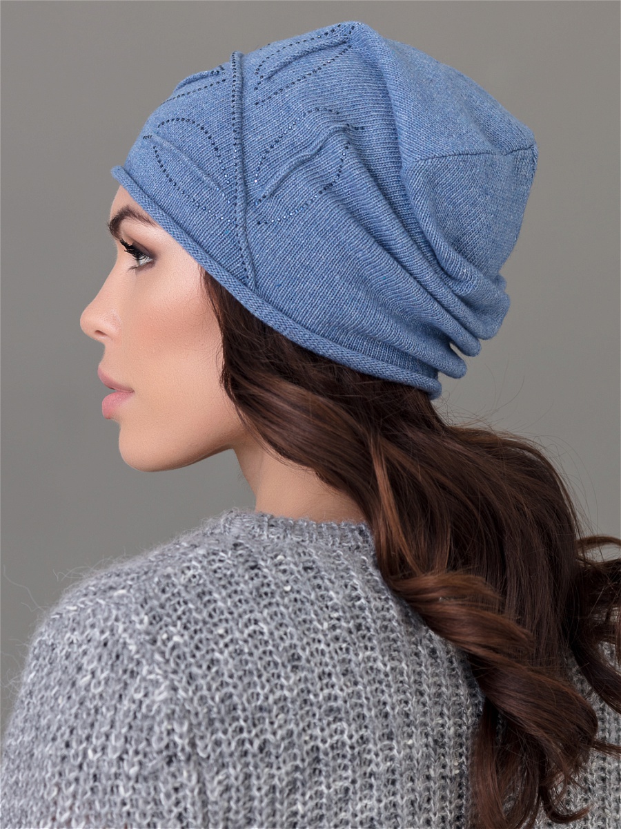 Одинарная шапка из нежной пряжи с добавлением кашемира. Декорирована элегантным узором в виде ветки с отстроченными элементами, дополненный композицией из страз в виде лепестков. Фабрика Junberg, Россия.