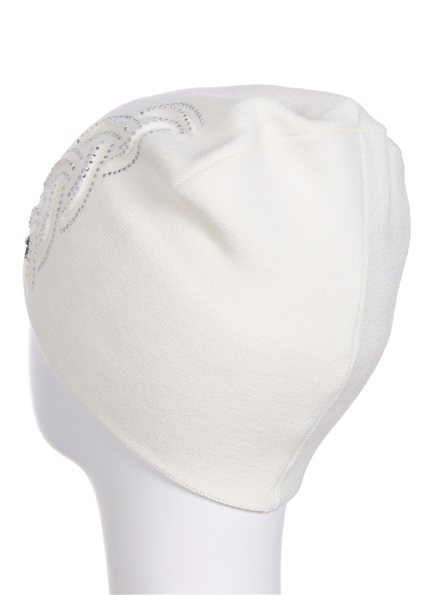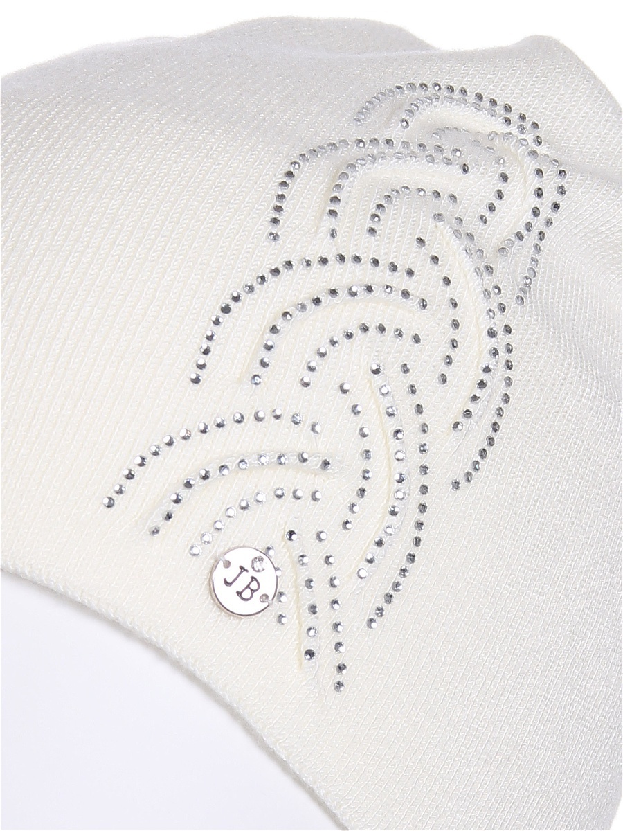 Одинарная шапка из мягкой итальянской пряжи. Декорирована композицией из страз в виде косы и отстрочкой внутри рисунка. Фабрика Junberg, Россия.