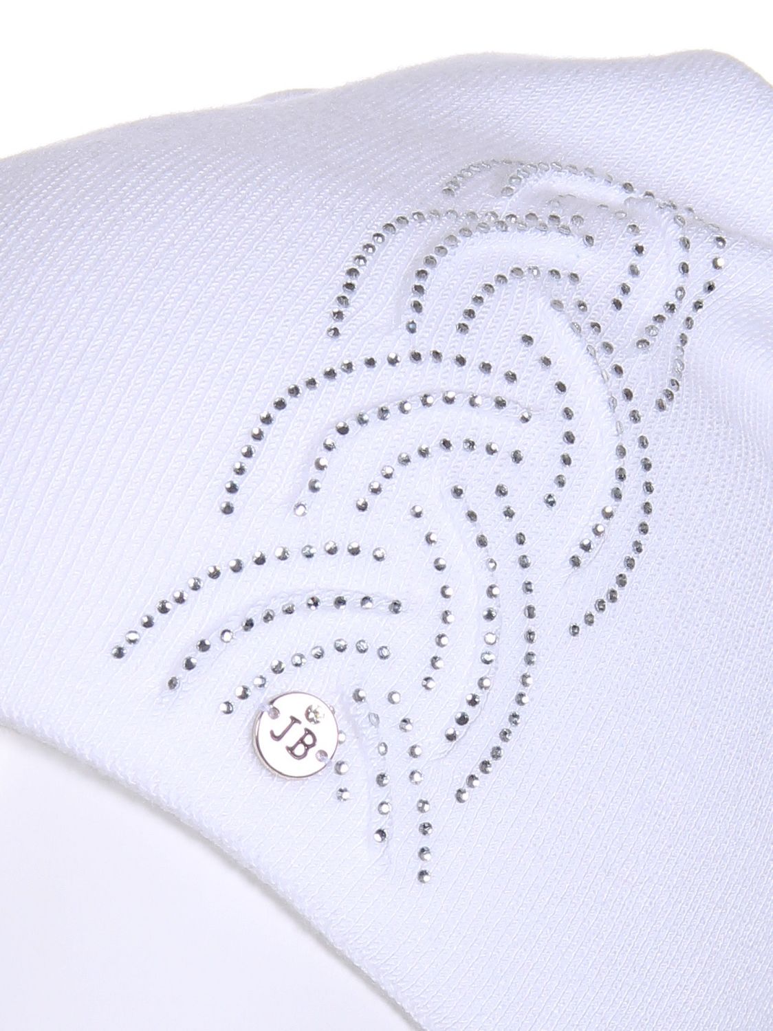 Одинарная шапка из нежной пряжи с добавлением кашемира. Декорирована элегантным узором в виде ветки с отстроченными элементами, дополненный композицией из страз в виде лепестков. Фабрика Junberg, Россия.