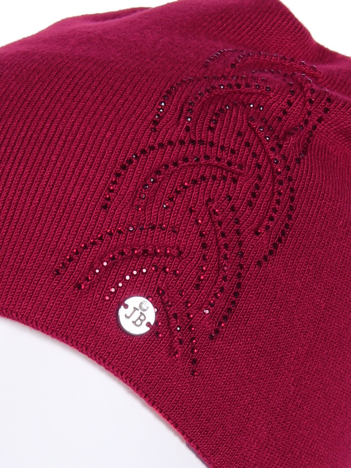 Одинарная шапка из нежной пряжи с добавлением кашемира. Декорирована элегантным узором в виде ветки с отстроченными элементами, дополненный композицией из страз в виде лепестков. Фабрика Junberg, Россия.